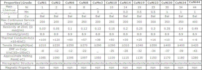 CuNi1, CuNi2, CuNi6, CuNi8, CuNi10, CuNi14, CuNi19, CuNi23,CuNi30, CuNi34, CuNi44.